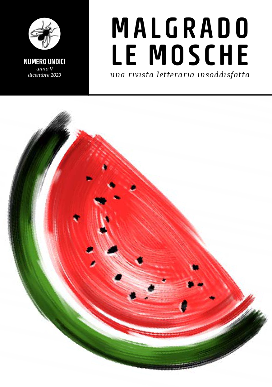 Si chiude anche il ricapitolo dei racconti del nostro cosiddetto vecchio corso, che sarebbe stato seguito da una certa sequela di crisi d’identità, sia come persone che come rivista e poi sappiamo tutte come è andata a finire, non è cambiato quasi niente, si cerca sempre di fare il possibile, ma con più ansia, adesso perché sai mai che ci bombardino. Sarebbe allarmante considerare che la nostra cara anguria palestinese già era là da tre mesi. Parliamo di tre anni fa. Vabè.