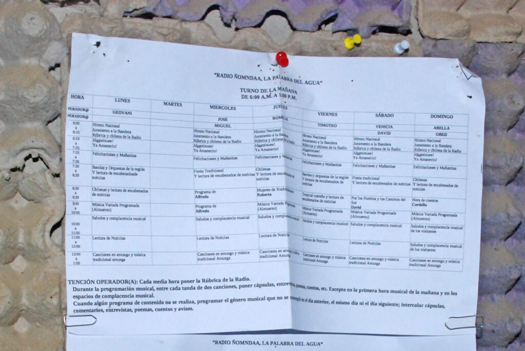 Il 13 luglio 2010, in sella al nostro ruggente furgoncino, stavamo scorrazzando per intervistare gli speaker e gli attivisti locali, mangiando caldo de pollo a tavola con i compas mexicani. Immaginate di sentire in sottofondo, tra una cucchiaiata e l’altra, i programmi dell’emittente – che trattano di salute, diritti delle donne, storie in lingua amuzga e musica tradizionale – nati in risposta a una situazione insostenibile. Partendo da quest’ultima, proviamo a mettere insieme alcuni concetti chiave come: indifferenza, corruzione degli organi statali e federali, violazione dei diritti umani, discriminazione, difficile accesso alla giustizia per le popolazioni indigene. Se uniamo i puntini ne ricaveremo la cartina fisica della regione del Guerrero, ma potremmo estenderla alle regioni limitrofe, e clonarla fino a farla assomigliare a quelle di altri stati dove quel famoso dio, nominato alla carlona diverse righe fa, non mette piede dall’alba dei tempi. Mossi dalla curiosità si potrebbe chiedere agli interlocutori come sono riusciti ad avere la meglio sul mal gobierno, costruendo una radio clandestina con un’antenna grande quanto un campanile. Per procedere in ordine cronologico, sarebbe cosa buona aprire una parentesi tonda e una quadra per dire che Ñomndaa nasce dopo anni di abusi subiti dagli indigeni, soggiogati sia dai dispotici caciques che dal partito oppressore PRI. Ispirati dagli zapatisti del Chiapas, nel 2002 gli abitanti di Xochistlahuaca si organizzano nel Frente Cívico Indígena, dichiarandosi municipio autonomo. Due anni dopo prende vita Radio Ñomndaa.